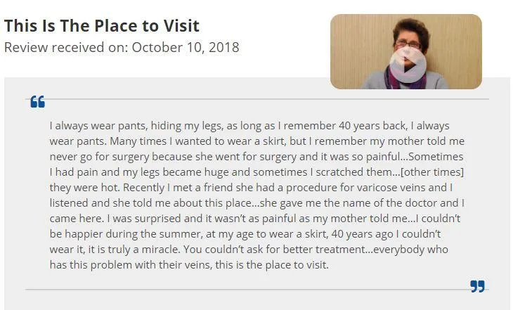 “I always wear pants, hiding my legs, as long as I remember…I met a friend and she told me about USA Vein Clinics… I came here and I was surprised. It wasn’t painful…I couldn’t be happier during the summer. At my age, I wear a skirt. I couldn’t wear it 40 years ago… You couldn’t ask for better treatment…everybody who has this problem with their veins, this is the place to visit.”