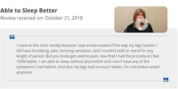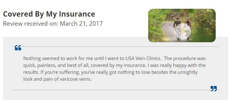 “Nothing seemed to work for me until I went to USA Vein Clinics. The procedure was quick, painless, and best of all, covered by my insurance. I was really happy with the results. If you’re suffering, you’ve really got nothing to lose besides the unsightly look and pain of varicose veins..”